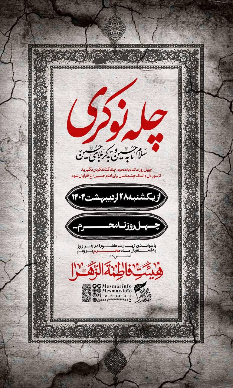 با مدد الهی و عنایت حضرت ولی عصر(عج) حسینیه فاطمة الزهرا(س) در نظر دارد ؛همانند سالیان گذشته پویش چله نوکری را از روز یکشنبه بیست و هشتم اردیبهشت 1404 تا روز ششم تیرماه 1404 آغاز کند .